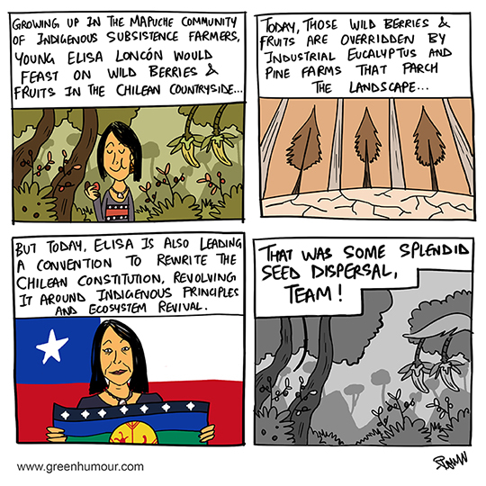 On Elisa Loncon, an indigenous Mapuche political leader leading the convention to rewrite Chile's constitution with indigenous principles at its centre. Comic from my column with The Hindu.