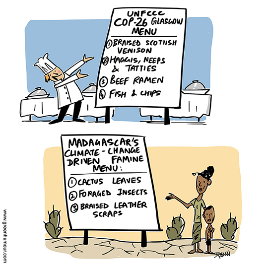 A comparison of the menus of COP 26 and the climate-change induced famine raging in Madagascar. Cartoon from my Gocomics column.