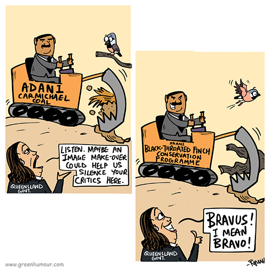Adani's Carmichael Coal Mine (renamed 'Bravus' because the company mistakenly thought the word means 'brave' when it quite appropriately means 'crooked') launched a conservation plan for the endangered Black-throated Finch to cover up their act. The finch is threatened by mining and resulting habitat loss. The conservation plan was found to be hogwash by a Queensland government scientific panel. The report was eventually buried by the Queensland government. Cartoon from my column with The Hindu.
