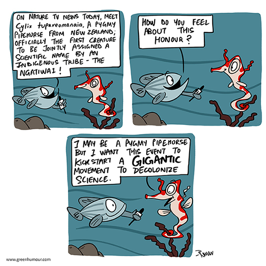 Meet Cylix tupareomanaia, a Pygmy Pipehorse from New Zealand : the world's first creature to be officially named in collaboration with an indigenous tribe, the Ngatiwai. The species name in Maori translates to 'garland of the seahorse'.Comic from my column with The Hindu Sunday Magazine.
