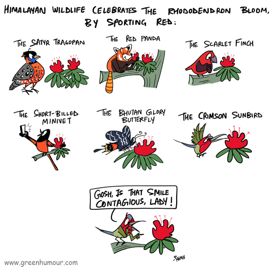 Come March, and red Rhododendron flowers can be seen painting the Himalayas red their vibrance. Here are some Himalayan animals celebrating the bloom, and wishing my readers a happy Holi. Cartoon from my column with Roundglass Sustain.