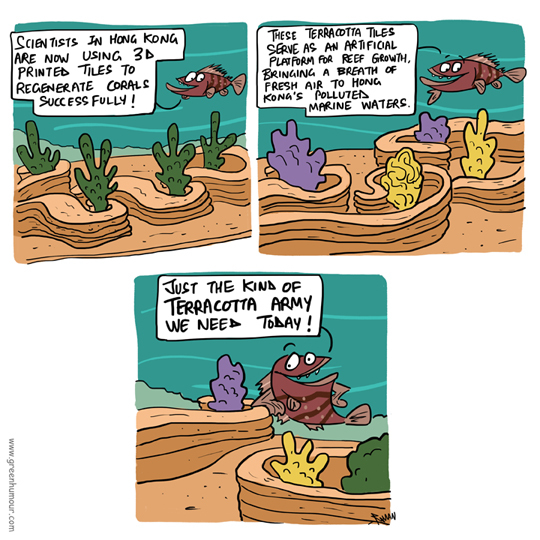 Researchers in Hong Kong are using 3-d printed terracotta tiles to revive coral reefs in polluted waters! Comic strip from m Sunday Mid-Day column.