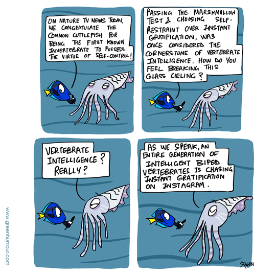 The Common Cuttlefish has recently passed the Marshmallow Test, making it the first known invertebrate to possess the virtue of self control! Comic from my column with The Hindu.