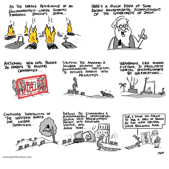 COVID resurgence and the Indian government's environmental response to a zoonotic disease. Comic from my column with Sunday Mid-Day. Completing 5 years of publishing Green Humour on Sunday Mid-day today.