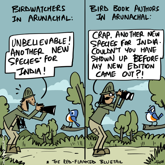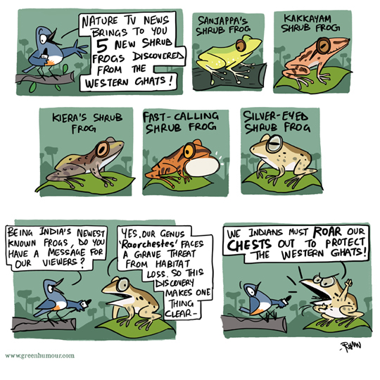 Even as the Western Ghats continue to face assault from linear intrusion, scientists have discovered five new shrub frogs! Congratulations to Sonali Garg, Robin Suyesh, Sandeep Das, Mark Bee and SD Biju for the discovery, and for yet another reminder of the Western Ghats' ecological significance to India. Comic from my column with Sunday Mid-Day.