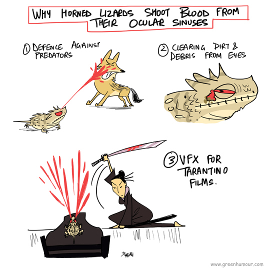Horned Lizards are a genus of North American lizards famous for their bizarre defence mechanism: shooting a spurt of blood from their ocular sinuses at their predators! Cartoon from my column with Roundglass Sustain, featuring one of my favourite characters in cinema: Kill Bill's O Ren Ishi, played by the amazing Lucy Liu.