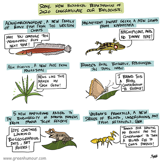 Trust biologists to make even 2020 a better year! Here are just a few of the many discoveries made this year in India, congratulating the biologists who unearthed them. Cartoon from my RoundGlass Sustain column. (If you wish to go through all the species discovered in India in 2020, email me on rohanchakcartoonist@gmail.com). Happy 2021 , dear readers! Here's hoping for many more such breakthroughs in '21.