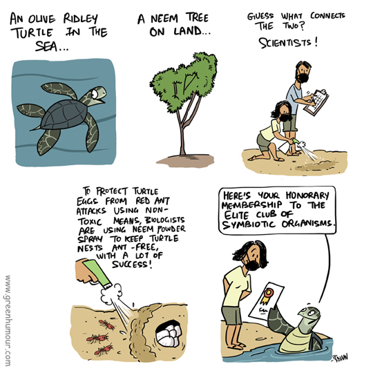 Researchers Anuja Vartak and Sumedha Korgaonkar have figured out a novel, eco-friendly way to protect Olive Ridley Turtle nests from ant infestations: neem-based sprays! Comic from my column with Sunday Mid-Day. Read more about their work here.