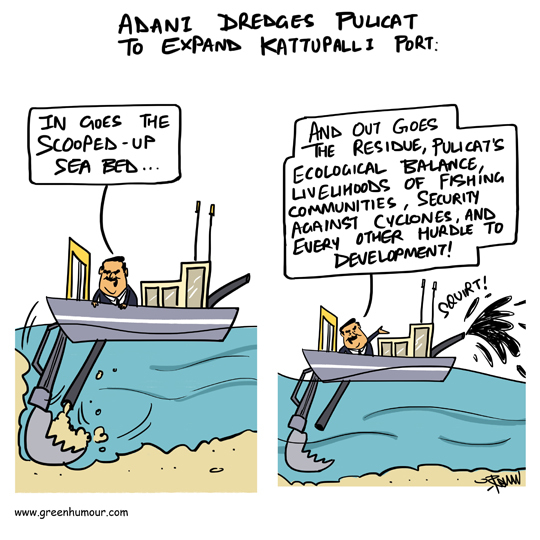 The Adani International Environmental Crime Syndicate has had its eyes on taking more of Pulicat Lake for a while now. The public hearing for their 6000+ acre megaport in the lagoon, which will not only destroy marine wildlife, flood catchments, and cyclone buffers, but will also displace lakhs of people, is scheduled for the 22nd of January, 2021. Comic from my column with The Hindu Sunday Magazine.