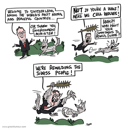 Peaceful Switzerland. Neutral Switzerland. WILD Switzerland! Cartoon from my column with The Hindu on Switzerland's controversial wolf cull, starring Environment Minister Albert Rosti. Amidst major efforts to rewild Europe, the concept of co-existence, like always, seems to be eluding the continent.