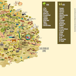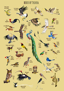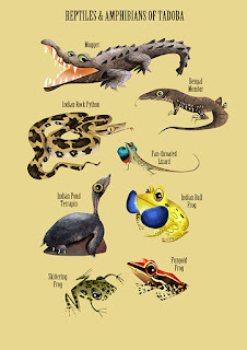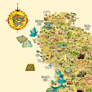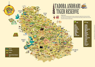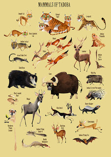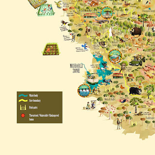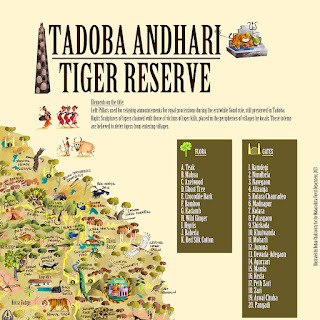 While Tadoba's teak, ain and baheda forests offer refuge to tigers, leopards, sloth bears, dholes, honey badgers, small cats and a variety of herbivores like the Gaur and Sambar, its lakes are home to mugger crocodiles and a healthy population of the near-threatened Grey-headed Fish Eagle, making the reserve an eco-tourism hotspot. I hope that the map illustration succeeds in sensitizing state authorities about the biodiversity that the park abounds with, and in serving as a reminder of all that is threatened by the expansion of mining operations and roadways in the region. The map will be on display and available as souvenirs at the park's museums and interpretation centres.