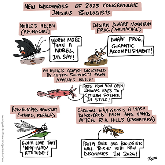 Newly discovered species from 2023 congratulate India's biologists for all the discoveries and rediscoveries made this year! Let's hope that our biologists will BRB with new ground-breaking science in 2024! Comic for Roundglass Sustain.