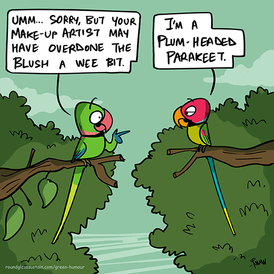 Ever overdone your make-up and felt you resemble a Plum-headed Parakeet? Cartoon from my column with Roundglass Sustain.