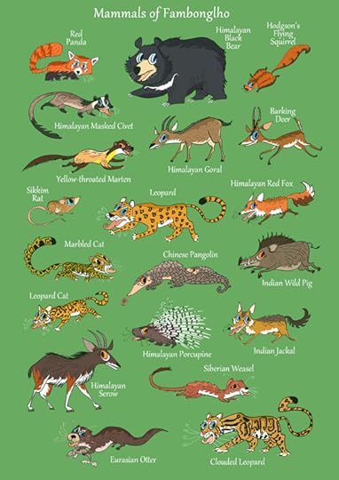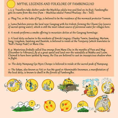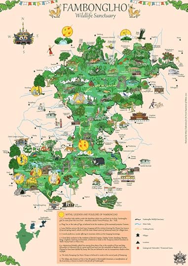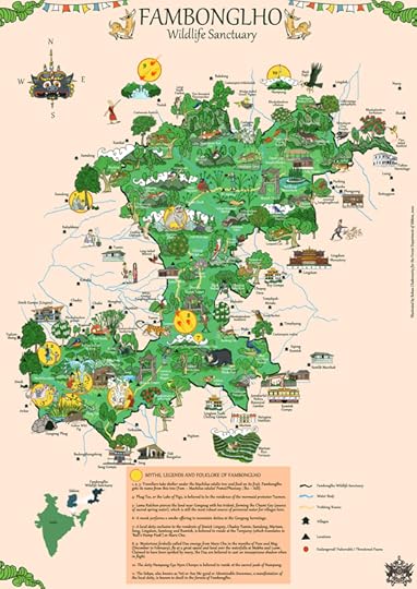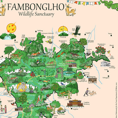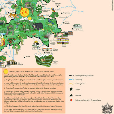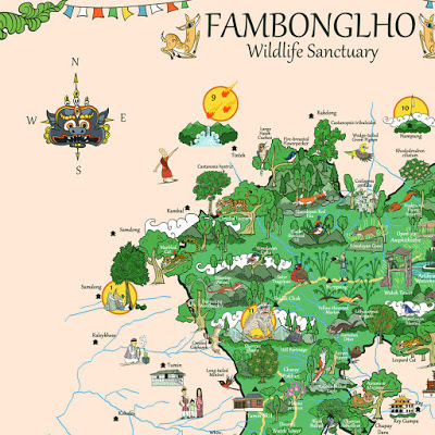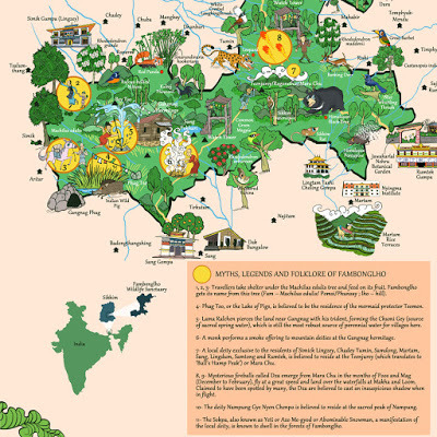 Fambonglho Wildlife Sanctuary in Sikkim is a lot more than just a wildlife sanctuary: a place where mythology and folklore meet conservation. Here's a Thangka style illustrated map of Fambonglho created for the Forest Department of Sikkim, that merges the flora and fauna of the park with the myths and legends of indigenous communities that live in and around it. Click on the images for a larger view.