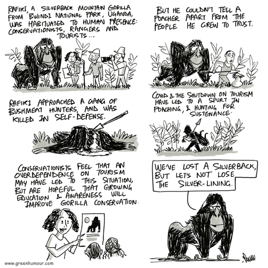 As the world mourns the killing of Rafiki, a popular silverback Mountain Gorilla from Bwindi Impenetrable National Park, Uganda, it is time for the world to wake up to the fact that grey areas in conservation need nuanced understanding and immediate attention. While we have traditionally been quick to blame poaching and poachers, the wildlife conservation narrative around the world needs to go past that, and address the social issues that drive wildlife crimes. This Mongabay interview of Gladys Kalema Zikusoka, a conservationist working on Mountain Gorillas, sheds timely light on many such 'grey areas' in conservation in Uganda, the knowledge of which can be applied to many such cases in India and around the world.