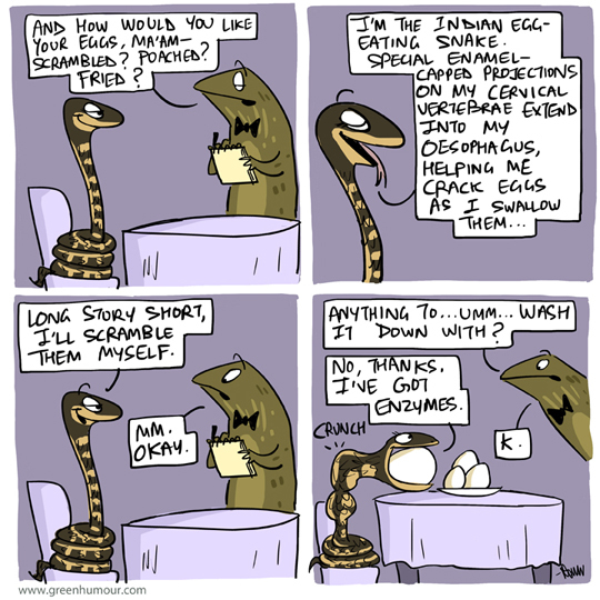 The Indian Egg-eating Snake is a specialized egg-eater! Vertebral hypapophyses, or enamel projections extending into the oesophagus from the cervical vertebrae help the snake crack eggs within its digestive tract. Imagine your vertebral bone poking into your food pipe!Comic from my column with Roundglass Sustain.