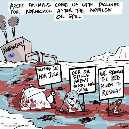 Russia's gift to the world on World Environment Day this year: An oil spill of 20000 tons in the Arctic city of Norilsk in Russia that has turned water bodies in its path red. Nornickel, a Russian Diesel company responsible for the spill has been sacked by the government and the city of Norilsk is under an emergency. Cartoon from my Gocomics page.