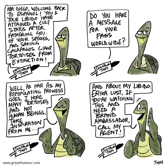 Diego, the legendary Galapagos Giant Tortoise who is credited with single-handedly pulling his species back from extinction thanks to his libido, has retired at the age of 100, and has returned to his native island of Espanol from the Galapagos National Park's breeding programme at Santa Cruz. Comic from my Gocomics page.