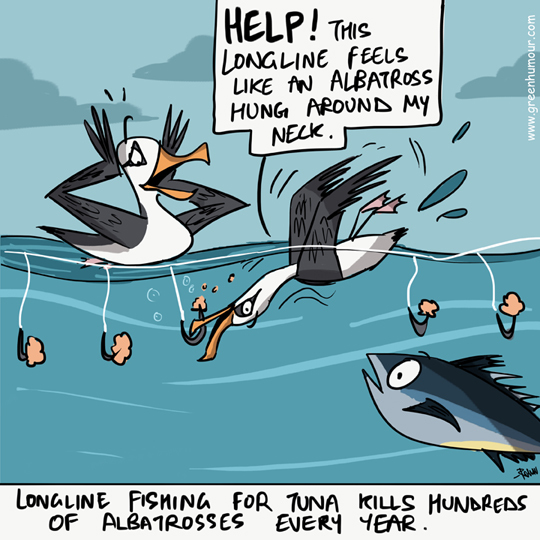On albatrosses and longline fishing from my column with Roundglass Sustain. Hundreds of albatrosses and other sea birds get caught as longline bycatch every year. In recent years, better cooperation between conservation organizations and fishermen has resulted in reduced mortality, by the application of simple measures like streamer lines.