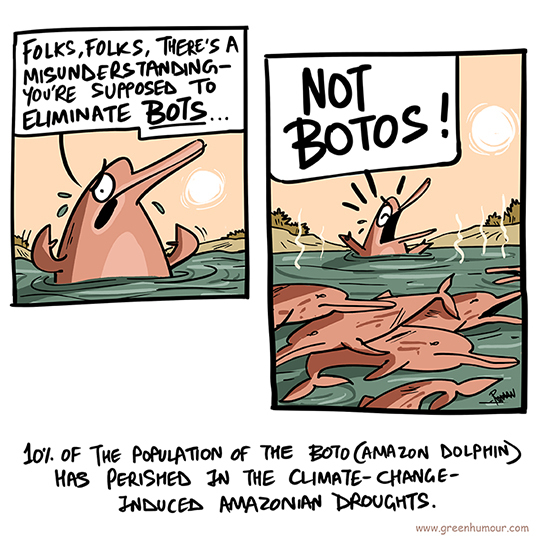 In more climate-change-induced panic this week, a heatwave records as well as hearts were shattered in Brazil’s Lake Tefe, with hundreds of Botos (Amazonian River Dolphins) reported dead. Carcasses also included those of the Tucuxi (Grey Dolphin) and thousands of fish. The deaths are estimated to have reduced the already endangered Boto population by 10% (report here).