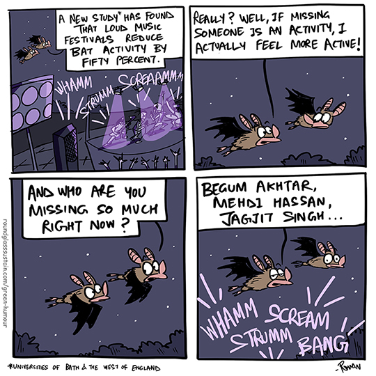 New research from the Universities of Bath and the West of England concludes that loud music festivals reduce bat activity by half, unsurprisingly so.