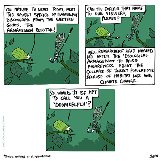 Meet the newest Indian damselfly discovered from Kerala's Western Ghats, named the 'Armageddon Reedtail' after the Ecological Armageddon. Comic from my column with The Hindu Sunday Magazine. A huge congratulations to Pankaj Koparde and team for the discovery!