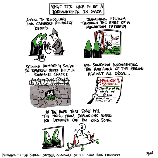 What is it like to be a birdwatcher in Gaza? My cousin, Dr. Sukrita Lahiri, a scholar on Palestinian gender studies, sent me this poignant piece by Marta Vidal and Ameera Harouda about birdwatching in Gaza, which prompted this comic, dedicated to the twin birdwatching duo, the Sirdah sisters, who co-authored the Gaza bird checklist.