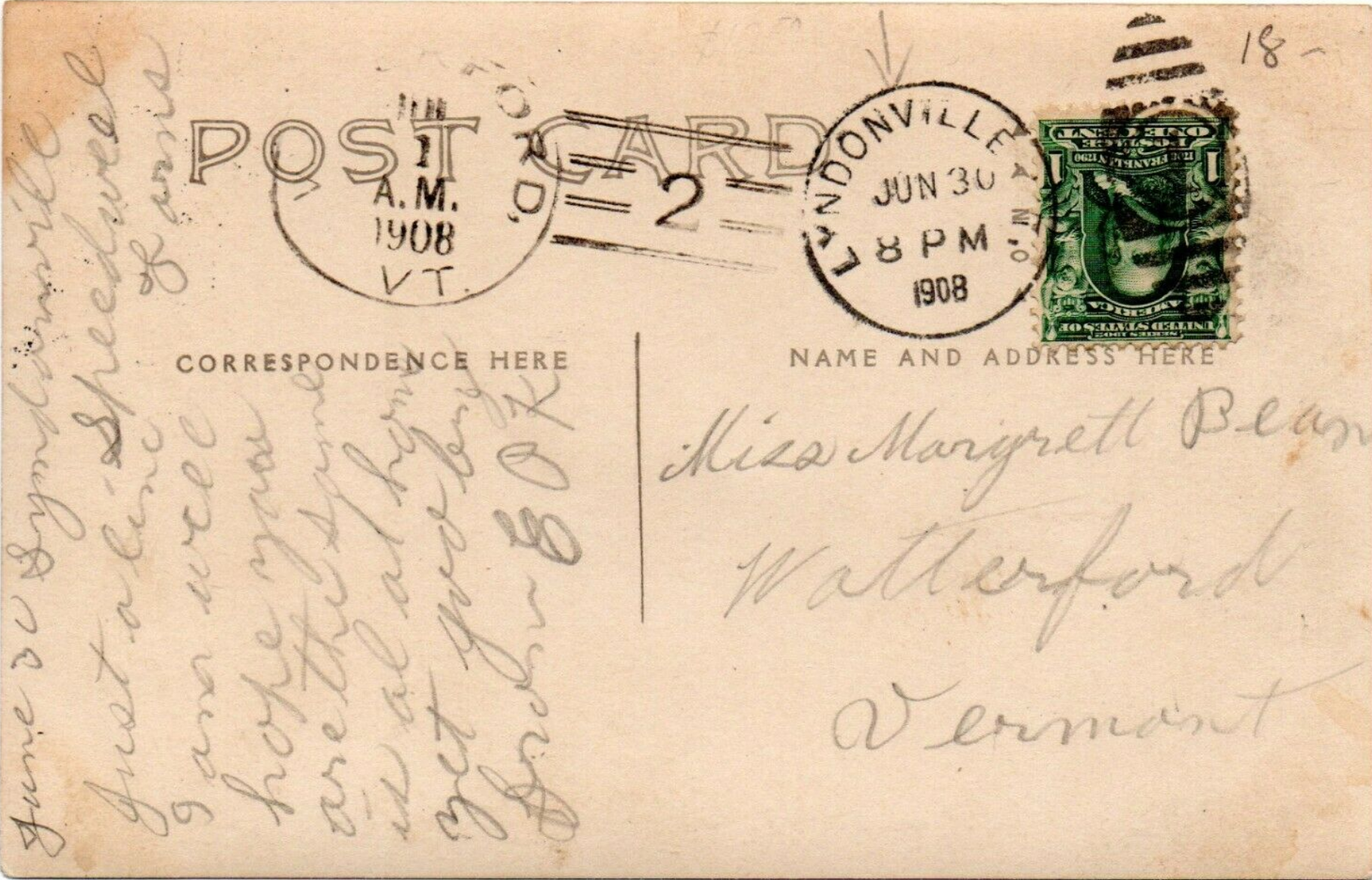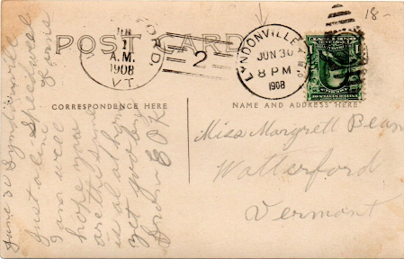 Finally, this postcard was mailed to Miss Margaret (spelled Margrett) Bean in "Watterford Vermont" -- that is, my own town of Waterford. It's postmarked in both Lyndonville and Waterford -- on June 30, 1908, at 8 pm, in Lyndonville, and then the next morning (July 1) in Waterford. I transcribe the writing as follows: