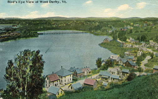 It's taken me time to absorb his tasks in with mine, since his death two years ago. But I am now hunting postcards when I have time. I picked up this one for its charming "Bird's Eye View of West Derby, Vt." (which is now part of Newport, Vermont), thinking we might not have the image itself among his Newport and Derby postcards.