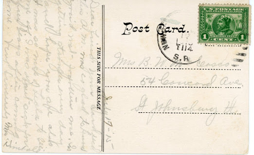 I puzzled over the address for a while, and came up with Mrs. B. W. McCosco, 54 Concord Ave., St. Johnsbury Vt. However, I thought I probably had the name wrong, since I'd never heard that name before. So I started pulling up town listings from the early 1900s. It didn't take long to realize that McCosco was indeed a local surname, and here's what I found: