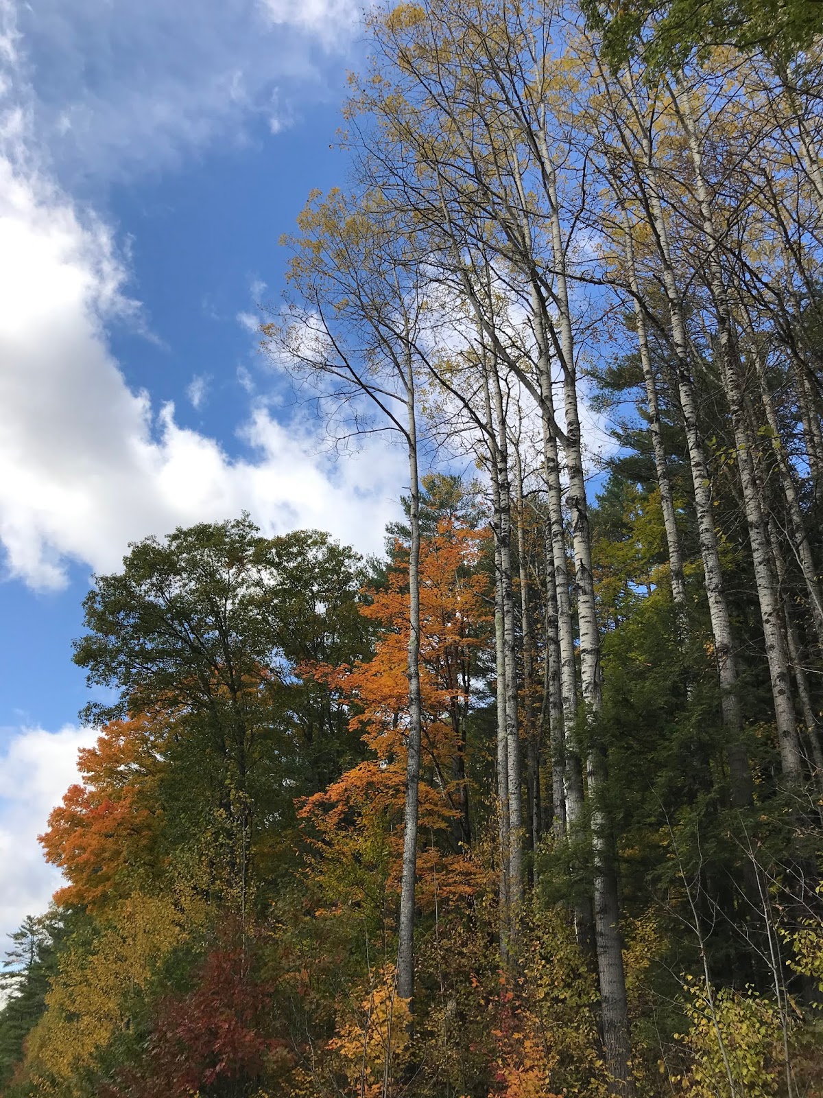 (deer, fox, squirrel, a flock of turkeys) and search the treesthere’s more blue sky than I first realized, flaming and yearning