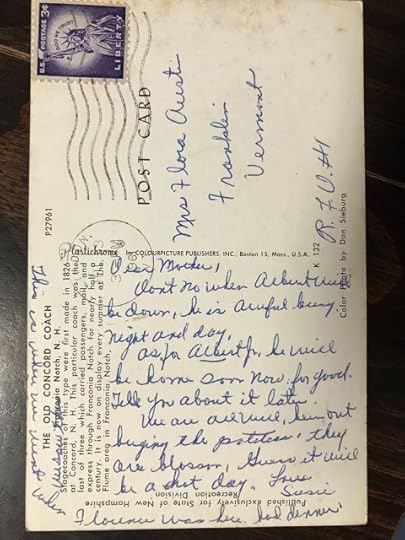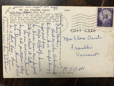 So of course, I went to Dave's stacks of postcards, and found right away this image of a Concord Coach: the kind of horse-drawn vehicle used to transport passengers and mail around New England and beyond. The card came from Franconia Notch, New Hampshire, mailed in 1961.