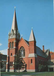 It's a good moment to remember that being Irish once meant a great deal in St. Johnsbury, Vermont. Just a few decades ago, the town's residents in response to the Census notched up 30% with Irish heritage. Significant in the area was the presence for decades of two Catholic churches: one "French" (mostly French Canadian, with Mass provided in both Latin and French), and "Irish" (Mass in Latin and English). The "Irish" church was St. Aloysius, pictured here; after the "French" church, Notre Dame des Victories, burned (yes, arson), the congregations merged and renamed the new church group St. John the Evangelist. Here's the building, from one of my late husband Dave Kanell's postcards.