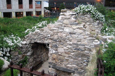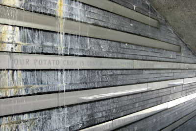 When I visit my New York City grandsons, I like to step across to their neighborhood's amazing Irish Hunger Memorial. Here are two photos of the structure, taken by Wally Gobetz and shared on flickr (thank you!); there's a description of the memorial added below, and if you don't have time to read it all, just keep this in mind: It's built from an actual stone cottage from Ireland, like the ones people lived in at the time of the potato famine there. I imagine the mud and stone and starvation made these homes feel terribly, frighteningly cold.