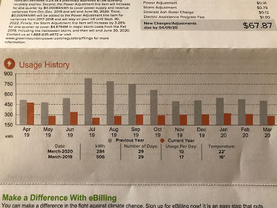 Just for perspective, here's the electric company's graph of how the year has gone. No dueling TVs drawing power as Dave keeps tabs on the 24/7 news cycle. No air conditioning. One person's lighting use, minimized as much as possible. Still bread being baked, but far less laundry to wash and dry.