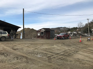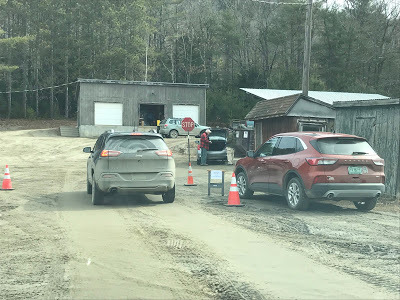 Today: A stop sign. Directions to form a single lane. "Social distancing," one vehicle at a time, for those bringing bags of trash to the big compactor. And the young man watching over the recycling shed wore a bright green mask over his mouth and nose.