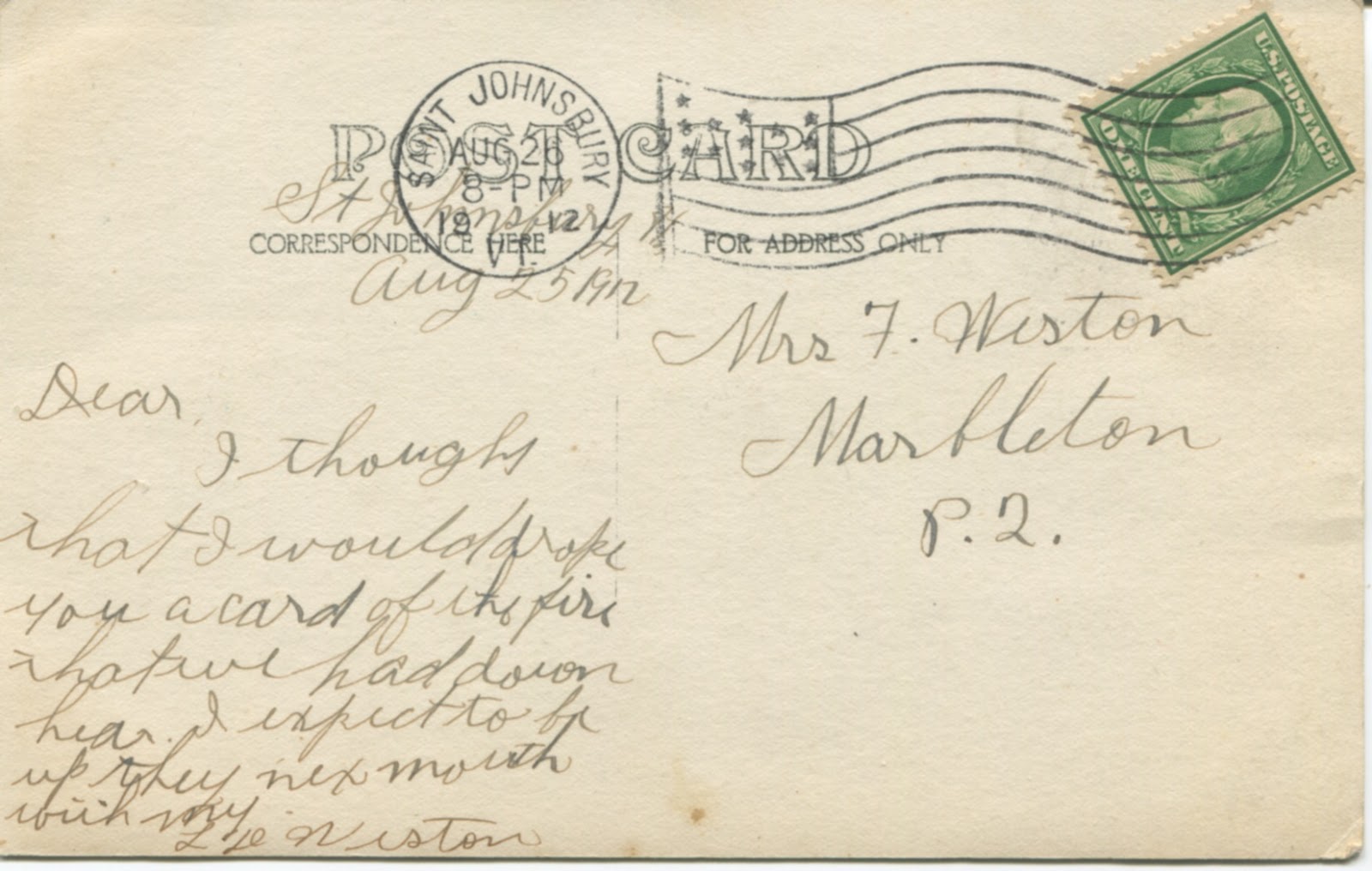 So this postcard became one of our Big Finds for 2015. It is what's called a "real photo postcard" -- someone photographed an actual scene and event, and had the picture made into cards. Three things alerted us to excitement here: the scene, which is after a disastrous fire; the postmark and hardwritten date, August 26 (25), 1912, in St. Johnsbury, Vermont; and the writer, L. D. Weston, who notes that he's writing to "Dear" Mrs. F. Weston, in Marbleton, Quebec, Canada.