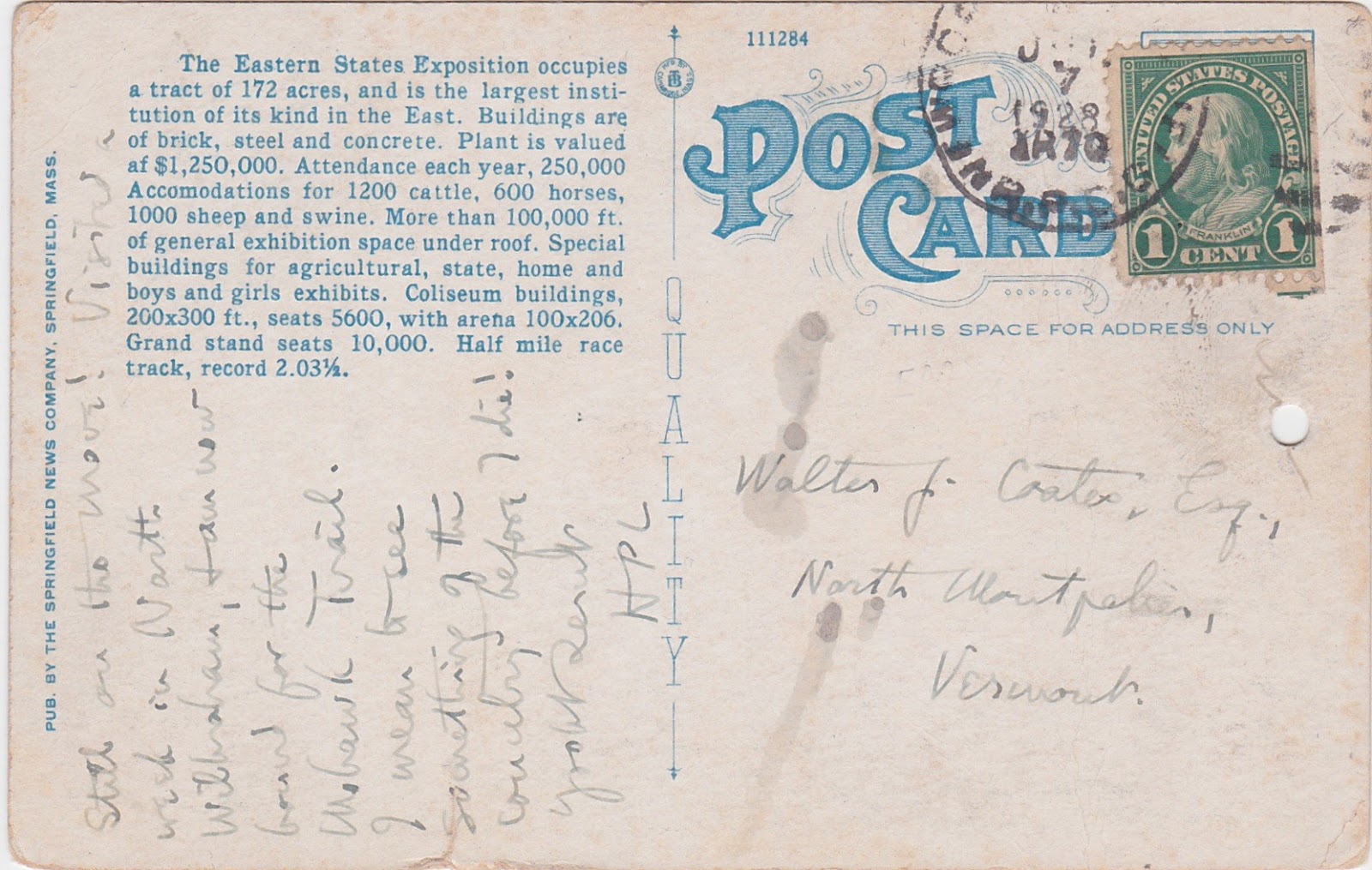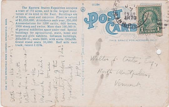 [Transcription: Still on the move! Visited a week in North Wilbraham, + am now bound for the Mohawk Trail. I mean to see something of the country before I die! (illegible) HPL] [Postmark date appears to be Oct 7 1928; the Mohawk Trail is a major road across northwestern Massachusetts.]