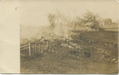 We were wrong in almost all of our early assumptions about the card, though! The name "Weston" immediately rang a bell for us, as we know there's a household including that name in East St. Johnbury today. We wondered whether it was connected to today's family, and whether the image showed a farm fire.