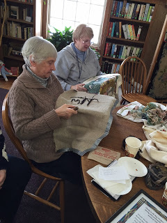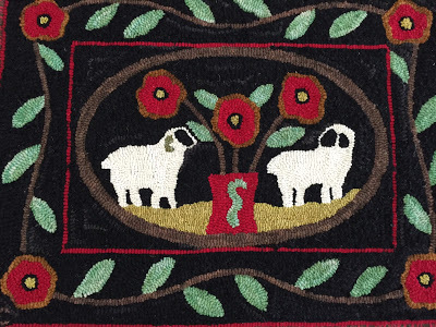 Yesterday I drove about 40 minutes north of here to a gathering of the Northeast Kingdom Rug Hookers Guild. I enjoyed watching the dynamics of this group of strong, creative crafters (including a boy maybe 12 years old who pounded out classical music on the piano in the room across the hall; he was someone's son). Many of the rugs featured wool, cut into thin strips, being "hooked" into the backings to create images. Some used yarn; one came from slivers of T-shirts.
