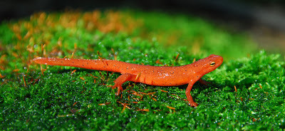Well, of course talking to it wasn't any use. I tenderly lifted it onto my palm -- the warmth turned the eft into a lively squirming tangle of legs and tail almost immediately, and I had to hurry across the road to release it before my fingers -- so much larger than its limbs! -- would damage it. It immediately hurried into the greenery, vanishing at once. Then I finished my walk, happy to have seen something that so rarely crossed paths with me.