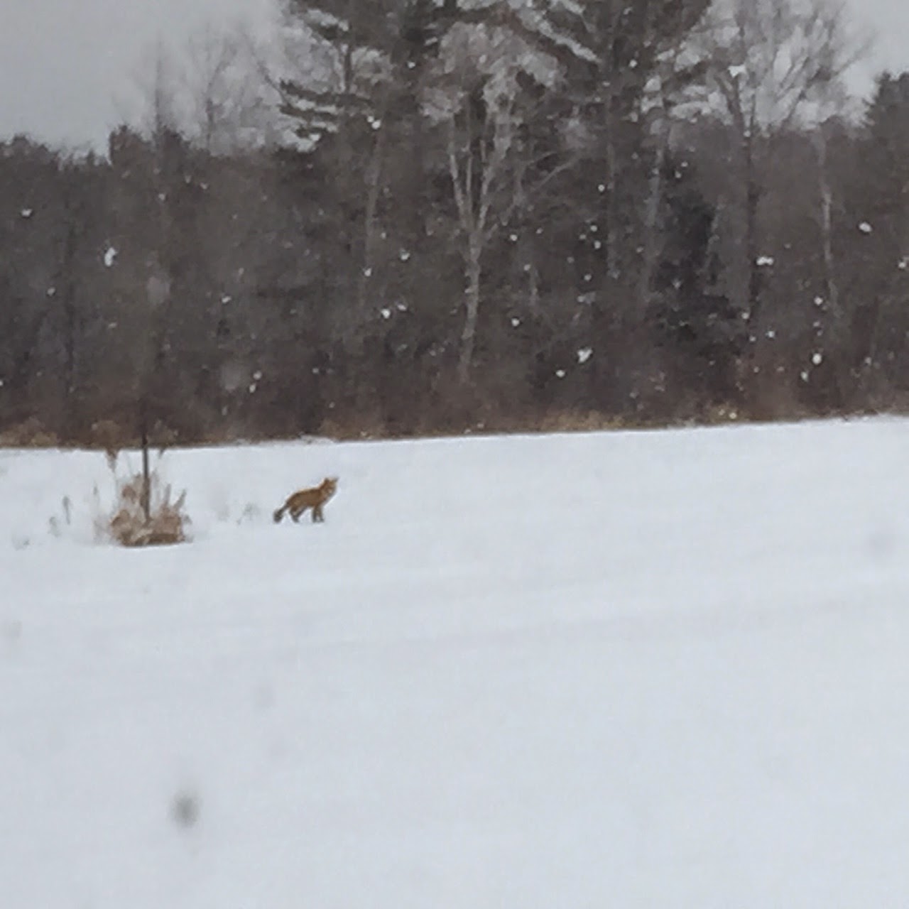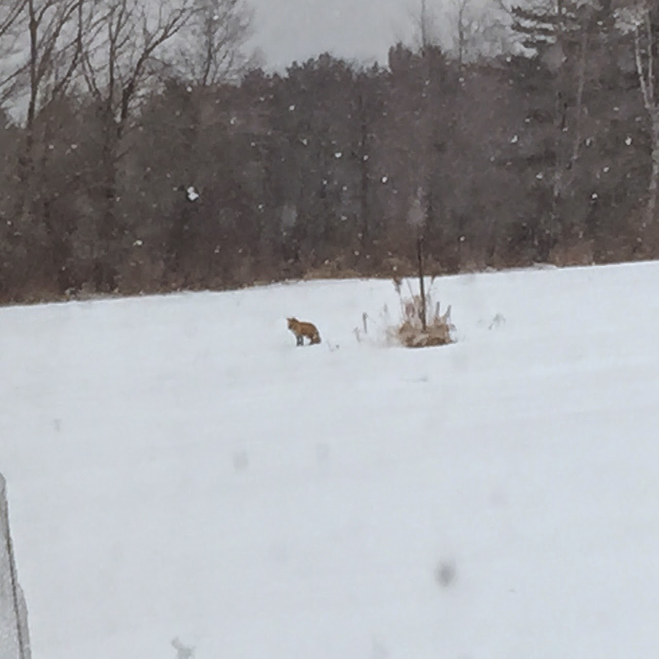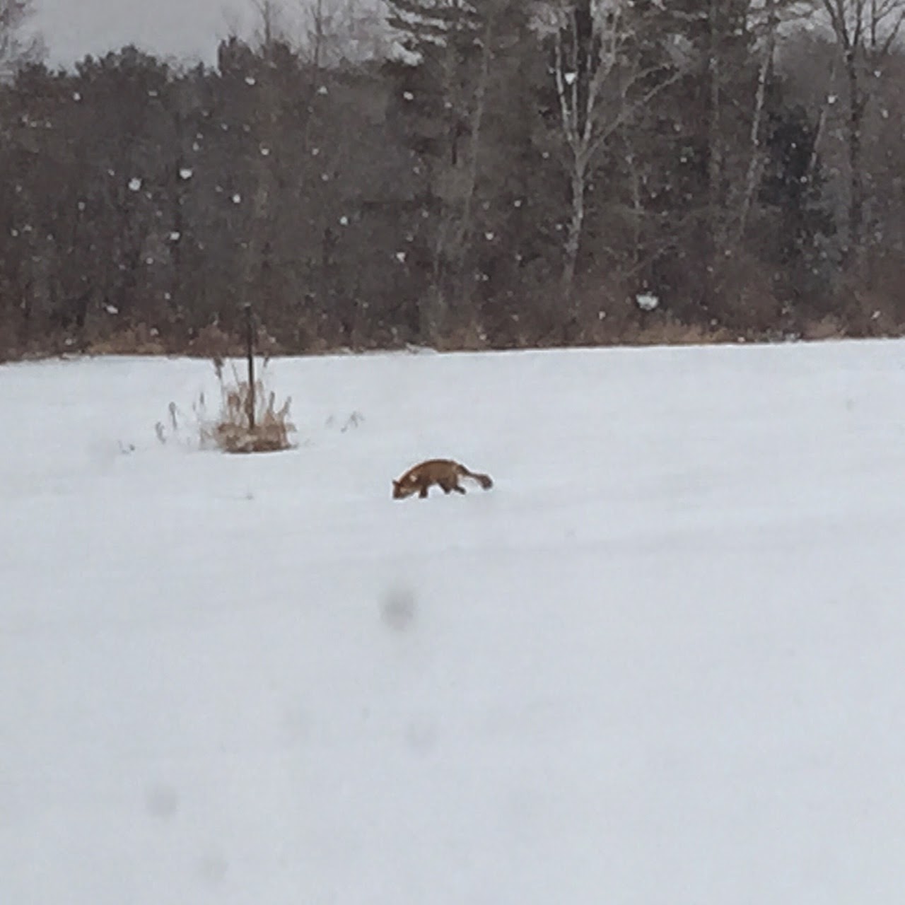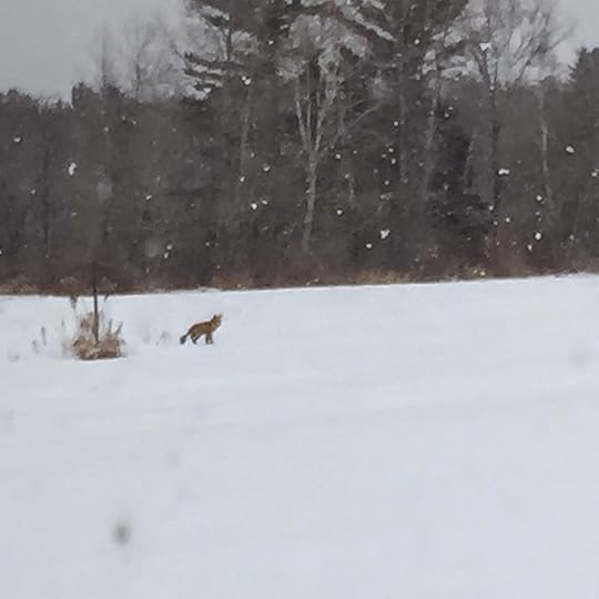 At any rate, I was sitting at the kitchen counter scribbling a first draft of a poem (shown at the bottom), which kept getting changed each time I looked at it (multiple drafts; and can we still call it "scribbling" on a computer? well, why not?), and out of the corner of my eye caught something in motion outside the kitchen window. In one coordinated leap, I grabbed the binoculars and made it to the window, and then ran to the next one, pulling out my cell phone and adjusting its bold little camera to "zoom." And here's the result: a fox that wove back and forth along the field, then came right down to the edge of the yard where the gardens begin, where a mouse must have been traveling under the snow. I watched the fox pounce, dig down, and snap up its snack and chew (with mouth open, eeyew).