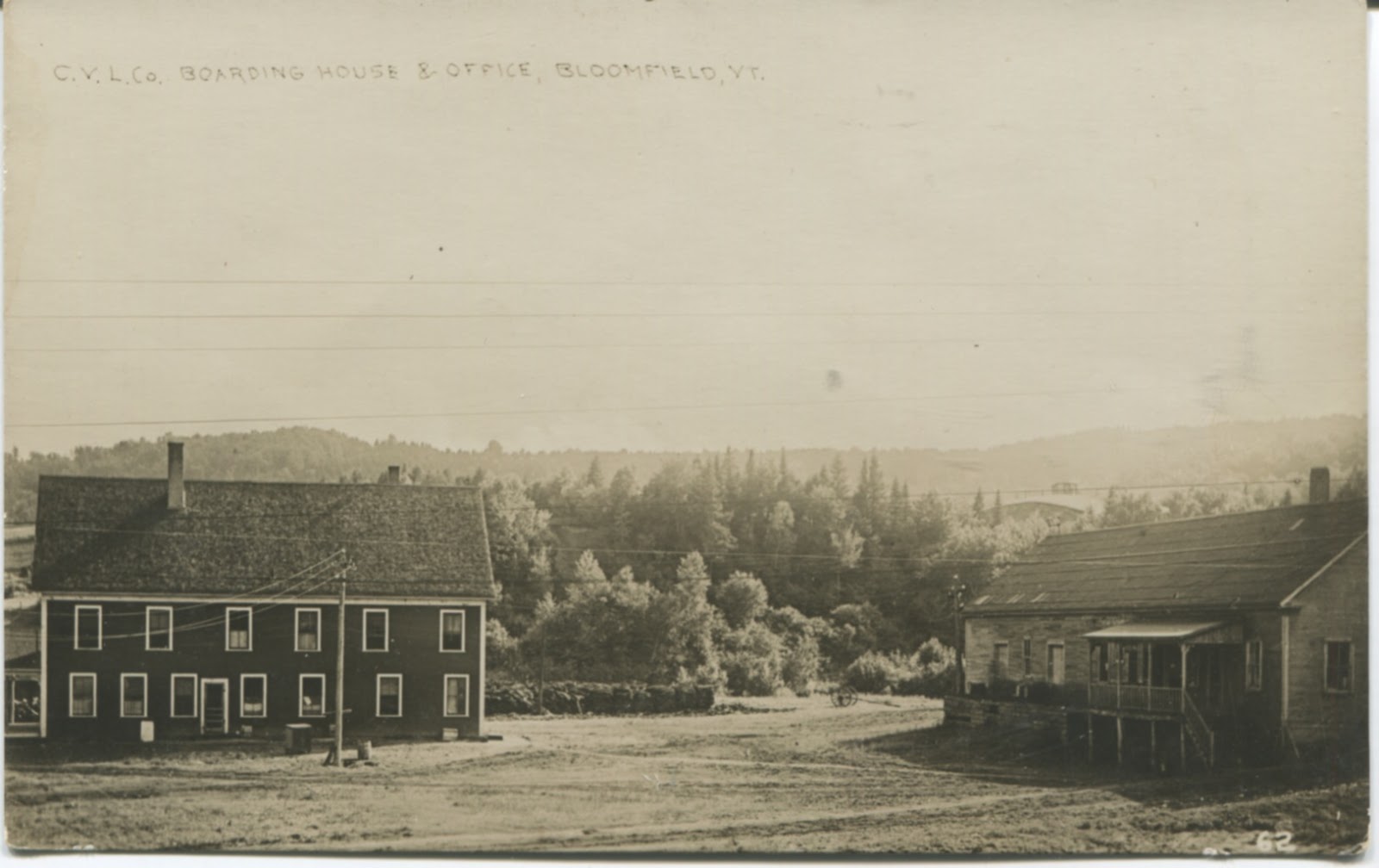 This boardinghouse and office of Van Dyke's C.V.L. Co. were in Bloomfield, Vermont -- most likely South Bloomfield, which was the earlier logging and milling center of the Essex County town. Today there are only about 265 residents of the town, but in the logging days it was a very busy place.