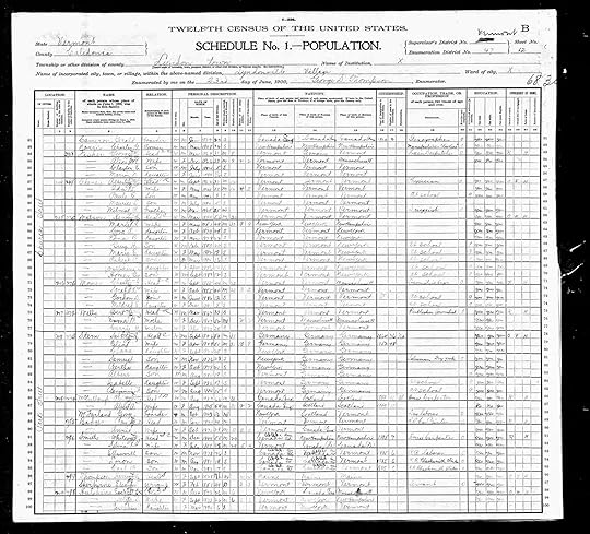 The Census from 1900 also provides details that I need -- here is one of its pages showing my "target of reseacrh," Albert Stern, still living at home with mom and dad even though he's 19 -- but then again, so is his older brother Samuel, 23, and their sister Clara, 25 ... or was it just something like a family meal that brought them together with the younger teens at home, Isabelle (17) and Benjamin (15)? Here's where the author's choices take over from the facts.