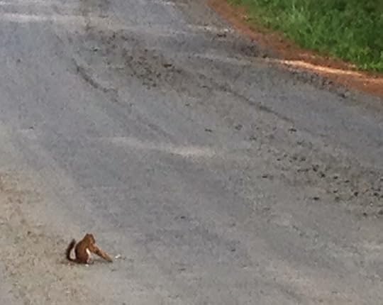 The little squirrel (a red one) stayed on task and let me get closer than most adult squirrels permit. But finally he/she grabbed the biggest chunk of the cone and bounded off into the scrub and woods next to the road.