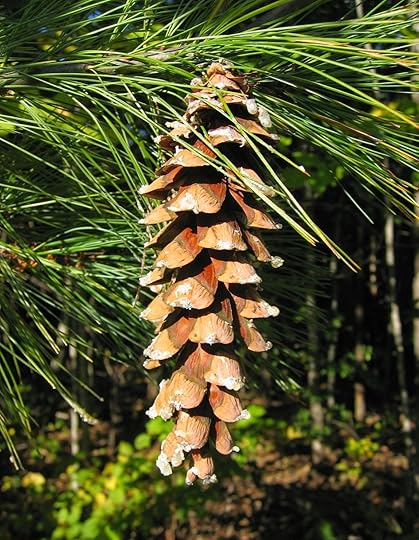 The squirrel's attention to the cone pushed me to wonder more about it. I looked up the cone today -- and that's why I put the term "pinecone" into quotation marks, as these fibrous seed carriers come on spruces and even birches, not just pines. But it does seem from my Audubon Society Field Guide to be a cone from a white pine.