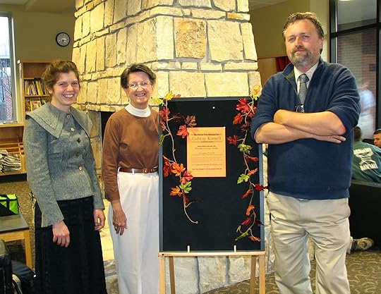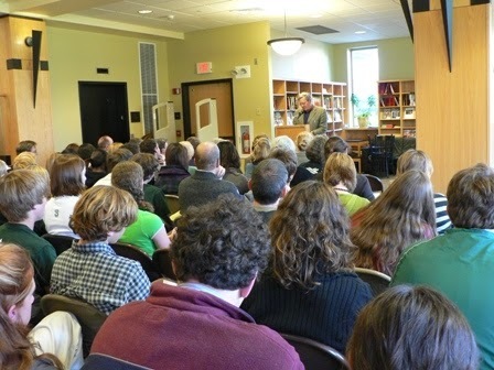 These photos (thank you, St J Academy -- were these taken by Denise? Jean?) are from the last time we helped create an event at St. Johnsbury (Vermont) Academy for Galway, in November 2007. He read just five poems -- but braided them together with generous stories about each one that kept the students (and the rest of us) captivated. I learned a lot that day about what it is to care about your audience: the people you write for, and the people you read your poems to.