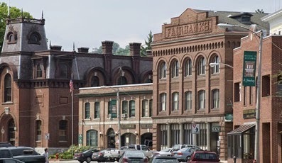 I gave to Scott images of the front and back of the postcard. I really wanted to also send along images of a building that has an important role in the story, the company store that the Fairbanks factory operated. But I got frustrated, trying to find a good image. This shows the structure at that location, more or less "today," in brick with the name FAIRBANKS inset up high on the building. But I wasn't sure it fit with the 1880s, and didn't know how to find the right version of the building.