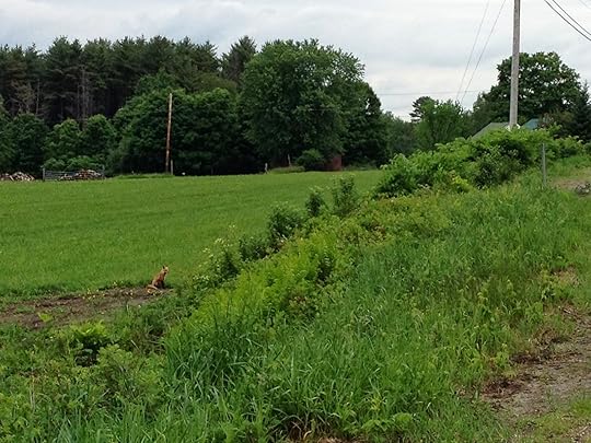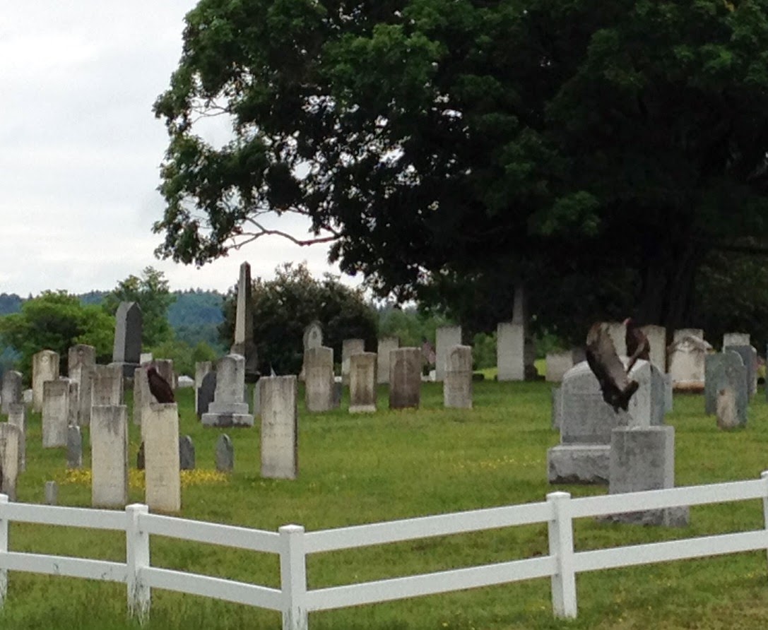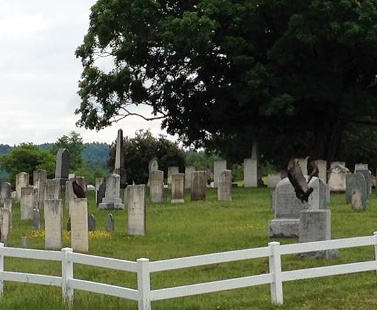 So, what was holding the flock of buzzards in place? It can't have been the small tattered mound on the road. It was barely enough for one buzzard to consume. I'm thinking cow ... the field is part of a dairy farm, and either a cow went down, or a calf didn't survive the birthing process and is tucked under the green growth where I can't see it, but the turkey buzzards can.