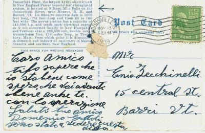 But I can't find any Zottoli in records of life in northern Vermont in 1939. So, in spite of what I wanted from this card, I have to conclude that Domenico Zottoli may have just been headed home after a visit to Mr. Zecchinelli, and passing through where the dam had recently been built.